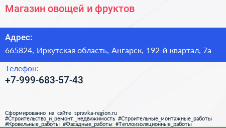 Магазин овощей и фруктов по адресу 665824, Иркутская область, Ангарск, 192-й квартал, 7а в дальнейшем Организация, размещена в следующих категориях: