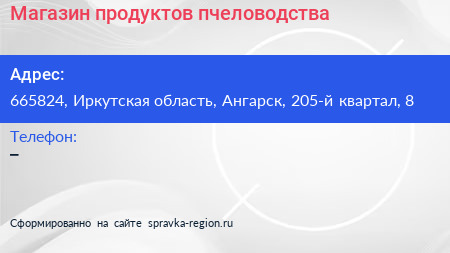 Магазин продуктов пчеловодства по адресу 665824, Иркутская область, Ангарск, 205-й квартал, 8 в дальнейшем Организация, размещена в следующих категориях: