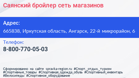 Саянский бройлер, сеть магазинов по адресу 665838, Иркутская область, Ангарск, 22-й микрорайон, 6 в дальнейшем Организация, размещена в следующих категориях: