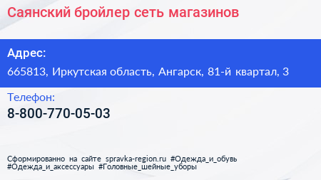 Саянский бройлер, сеть магазинов по адресу 665813, Иркутская область, Ангарск, 81-й квартал, 3 в дальнейшем Организация, размещена в следующих категориях:
