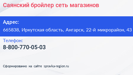 Саянский бройлер, сеть магазинов по адресу 665838, Иркутская область, Ангарск, 22-й микрорайон, 43 в дальнейшем Организация, размещена в следующих категориях: