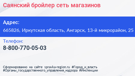 Саянский бройлер, сеть магазинов по адресу 665826, Иркутская область, Ангарск, 13-й микрорайон, 25 в дальнейшем Организация, размещена в следующих категориях: