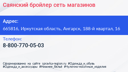 Саянский бройлер, сеть магазинов по адресу 665816, Иркутская область, Ангарск, 188-й квартал, 16 в дальнейшем Организация, размещена в следующих категориях: