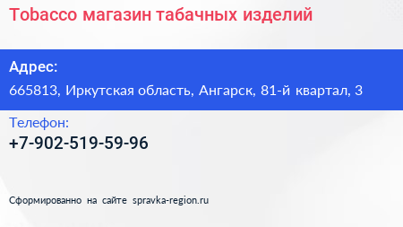 Tobacco, магазин табачных изделий по адресу 665813, Иркутская область, Ангарск, 81-й квартал, 3 в дальнейшем Организация, размещена в следующих категориях: