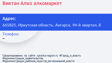 Виктан-Алко, алкомаркет по адресу 665825, Иркутская область, Ангарск, 94-й квартал, 8 в дальнейшем Организация, размещена в следующих категориях: