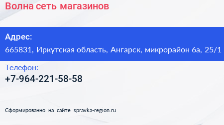 Волна, сеть магазинов по адресу 665831, Иркутская область, Ангарск, микрорайон 6а, 25/1 в дальнейшем Организация, размещена в следующих категориях: