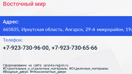 Восточный мир по адресу 665835, Иркутская область, Ангарск, 29-й микрорайон, 19а в дальнейшем Организация, размещена в следующих категориях: