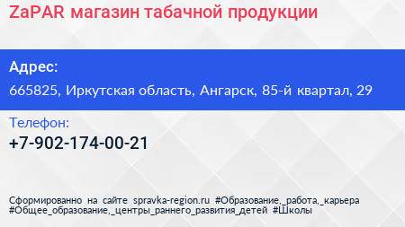 ZaPAR, магазин табачной продукции по адресу 665825, Иркутская область, Ангарск, 85-й квартал, 29 в дальнейшем Организация, размещена в следующих категориях:
