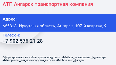 АТП-Ангарск, транспортная компания по адресу 665813, Иркутская область, Ангарск, 107-й квартал, 9 в дальнейшем Организация, размещена в следующих категориях: