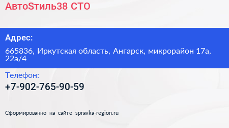 АвтоSтиль38, СТО по адресу 665836, Иркутская область, Ангарск, микрорайон 17а, 22а/4 в дальнейшем Организация, размещена в следующих категориях: