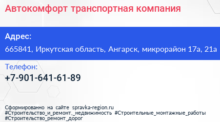 Автокомфорт, транспортная компания по адресу 665841, Иркутская область, Ангарск, микрорайон 17а, 21а в дальнейшем Организация, размещена в следующих категориях: