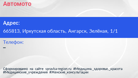 Автомото по адресу 665813, Иркутская область, Ангарск, Зелёная, 1/1 в дальнейшем Организация, размещена в следующих категориях:
