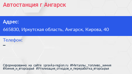 Автостанция, г. Ангарск по адресу 665830, Иркутская область, Ангарск, Кирова, 40 в дальнейшем Организация, размещена в следующих категориях: