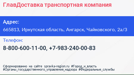 ГлавДоставка, транспортная компания по адресу 665813, Иркутская область, Ангарск, Чайковского, 2а/3 в дальнейшем Организация, размещена в следующих категориях: