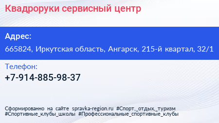 Квадроруки, сервисный центр по адресу 665824, Иркутская область, Ангарск, 215-й квартал, 32/1 в дальнейшем Организация, размещена в следующих категориях: