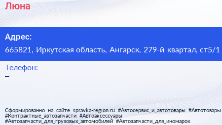 Люна по адресу 665821, Иркутская область, Ангарск, 279-й квартал, ст5/1 в дальнейшем Организация, размещена в следующих категориях: