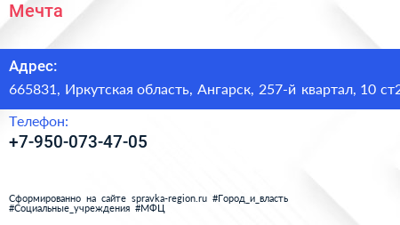 Мечта по адресу 665831, Иркутская область, Ангарск, 257-й квартал, 10 ст2 в дальнейшем Организация, размещена в следующих категориях: