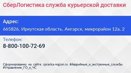 СберЛогистика, служба курьерской доставки по адресу 665826, Иркутская область, Ангарск, микрорайон 12а, 2 в дальнейшем Организация, размещена в следующих категориях: