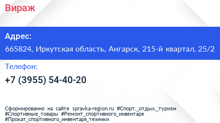 Вираж по адресу 665824, Иркутская область, Ангарск, 215-й квартал, 25/2 в дальнейшем Организация, размещена в следующих категориях: