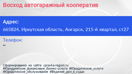 Восход, автогаражный кооператив по адресу 665824, Иркутская область, Ангарск, 215-й квартал, ст27 в дальнейшем Организация, размещена в следующих категориях: