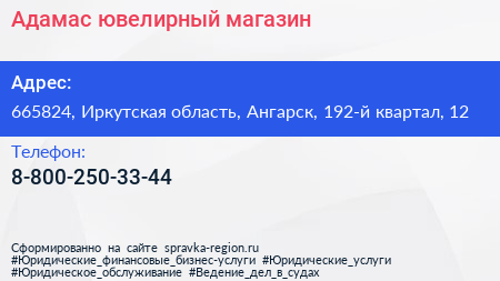 Адамас, ювелирный магазин по адресу 665824, Иркутская область, Ангарск, 192-й квартал, 12 в дальнейшем Организация, размещена в следующих категориях: