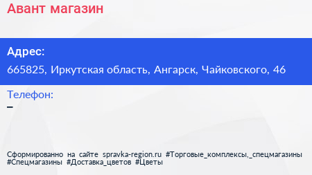 Авант, магазин по адресу 665825, Иркутская область, Ангарск, Чайковского, 46 в дальнейшем Организация, размещена в следующих категориях: