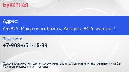 Букетная по адресу 665825, Иркутская область, Ангарск, 94-й квартал, 1 в дальнейшем Организация, размещена в следующих категориях: