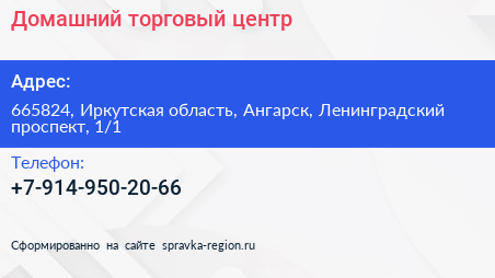 Домашний, торговый центр по адресу 665824, Иркутская область, Ангарск, Ленинградский проспект, 1/1 в дальнейшем Организация, размещена в следующих категориях: