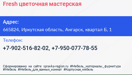 Fresh, цветочная мастерская по адресу 665824, Иркутская область, Ангарск, квартал Б, 1 в дальнейшем Организация, размещена в следующих категориях: