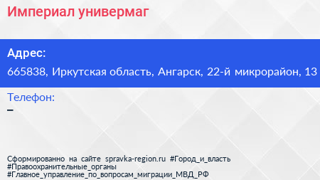 Империал, универмаг по адресу 665838, Иркутская область, Ангарск, 22-й микрорайон, 13 в дальнейшем Организация, размещена в следующих категориях: