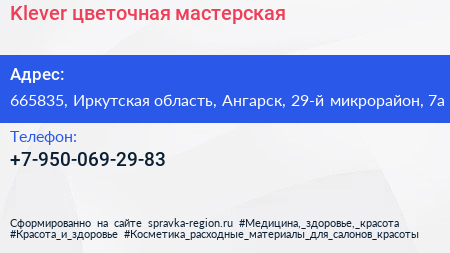 Klever, цветочная мастерская по адресу 665835, Иркутская область, Ангарск, 29-й микрорайон, 7а в дальнейшем Организация, размещена в следующих категориях: