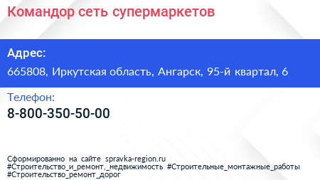 Командор, сеть супермаркетов по адресу 665808, Иркутская область, Ангарск, 95-й квартал, 6 в дальнейшем Организация, размещена в следующих категориях: