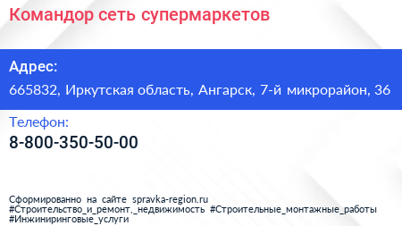 Командор, сеть супермаркетов по адресу 665832, Иркутская область, Ангарск, 7-й микрорайон, 36 в дальнейшем Организация, размещена в следующих категориях: