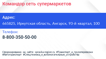 Командор, сеть супермаркетов по адресу 665825, Иркутская область, Ангарск, 93-й квартал, 100 в дальнейшем Организация, размещена в следующих категориях: