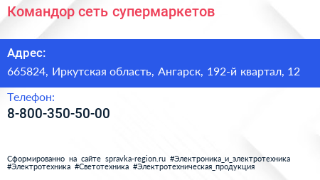 Командор, сеть супермаркетов по адресу 665824, Иркутская область, Ангарск, 192-й квартал, 12 в дальнейшем Организация, размещена в следующих категориях: