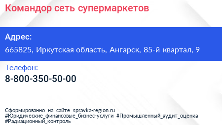 Командор, сеть супермаркетов по адресу 665825, Иркутская область, Ангарск, 85-й квартал, 9 в дальнейшем Организация, размещена в следующих категориях: