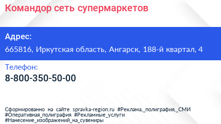 Командор, сеть супермаркетов по адресу 665816, Иркутская область, Ангарск, 188-й квартал, 4 в дальнейшем Организация, размещена в следующих категориях: