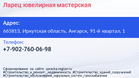 Ларец, ювелирная мастерская по адресу 665813, Иркутская область, Ангарск, 91-й квартал, 1 в дальнейшем Организация, размещена в следующих категориях: