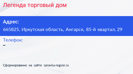 Легенда, торговый дом по адресу 665825, Иркутская область, Ангарск, 85-й квартал, 29 в дальнейшем Организация, размещена в следующих категориях: