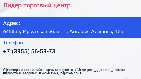 Лидер, торговый центр по адресу 665835, Иркутская область, Ангарск, Алёшина, 12а в дальнейшем Организация, размещена в следующих категориях: