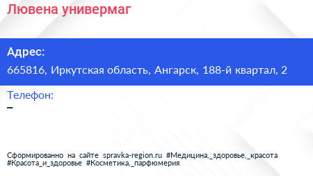 Лювена, универмаг по адресу 665816, Иркутская область, Ангарск, 188-й квартал, 2 в дальнейшем Организация, размещена в следующих категориях: