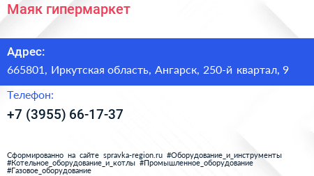 Маяк, гипермаркет по адресу 665801, Иркутская область, Ангарск, 250-й квартал, 9 в дальнейшем Организация, размещена в следующих категориях: