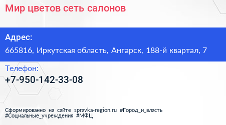 Мир цветов, сеть салонов по адресу 665816, Иркутская область, Ангарск, 188-й квартал, 7 в дальнейшем Организация, размещена в следующих категориях: