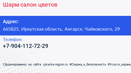Шарм, салон цветов по адресу 665825, Иркутская область, Ангарск, Чайковского, 29 в дальнейшем Организация, размещена в следующих категориях: