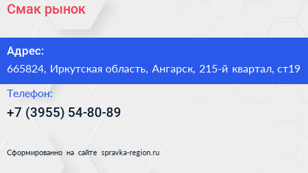 Смак, рынок по адресу 665824, Иркутская область, Ангарск, 215-й квартал, ст19 в дальнейшем Организация, размещена в следующих категориях:
