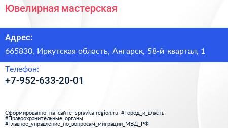 Ювелирная мастерская по адресу 665830, Иркутская область, Ангарск, 58-й квартал, 1 в дальнейшем Организация, размещена в следующих категориях: