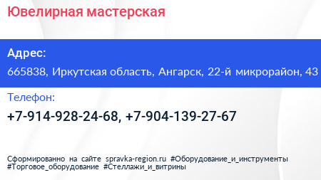 Ювелирная мастерская по адресу 665838, Иркутская область, Ангарск, 22-й микрорайон, 43 в дальнейшем Организация, размещена в следующих категориях: