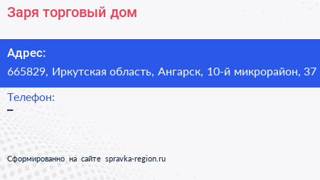 Заря, торговый дом по адресу 665829, Иркутская область, Ангарск, 10-й микрорайон, 37 в дальнейшем Организация, размещена в следующих категориях: