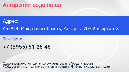 Ангарский водоканал по адресу 665824, Иркутская область, Ангарск, 206-й квартал, 3 в дальнейшем Организация, размещена в следующих категориях: