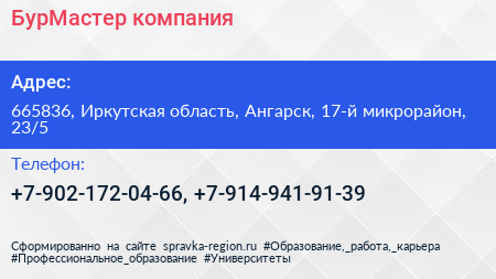 БурМастер, компания по адресу 665836, Иркутская область, Ангарск, 17-й микрорайон, 23/5 в дальнейшем Организация, размещена в следующих категориях: